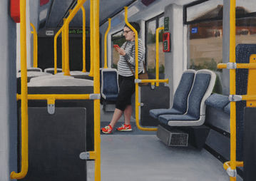 Peter’s realistic paintings always include someone absorbed in their personal technology. His compositions move from busy streets to quiet alleyways, each vignette a fascinating narrative of the life of today’s Mancunians. They are all stories of our time, of people going about their everyday lives, technology in hand.